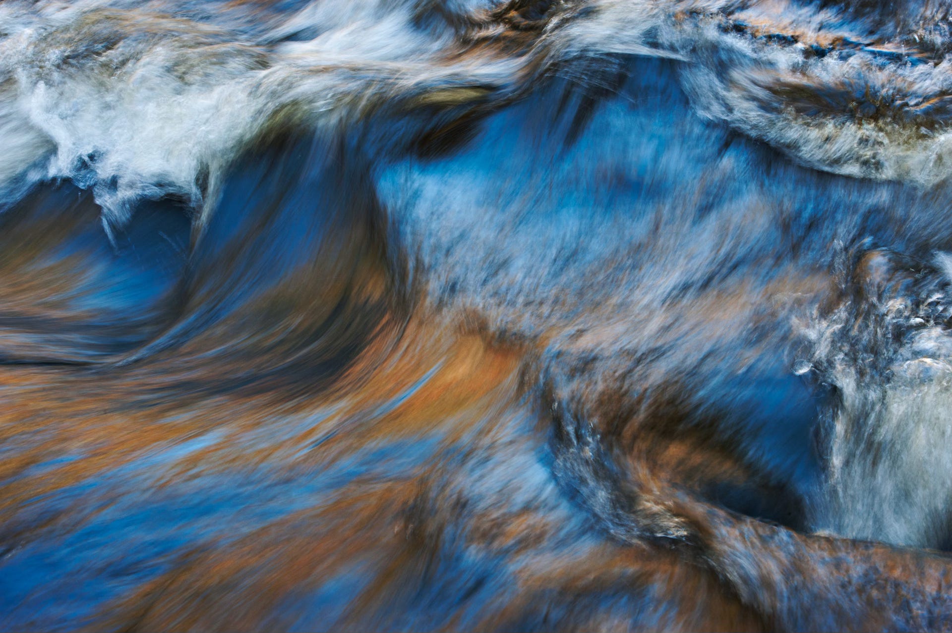Completely immersed in this connection, a visual dance between my eyes and the water, steadying myself as water pulsed and pushed downstream, I had the thought to take the camera off the tripod, to be more fluid in following the river on its journey, to be more like an ouzel, whirling like a leaf among beaten foam-bells; ever vigorous and enthusiastic. I moved myself and the camera, creating a brush stroke of color, again pressing the shutter at what I perceived the right moment.